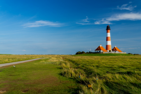 Der Westerhever Leuchtturm ist wohl bekannteste Leuchtturm Deutschlands und Wahrzeichen der nahe gelegenen Halbinsel Eiderstedt.