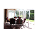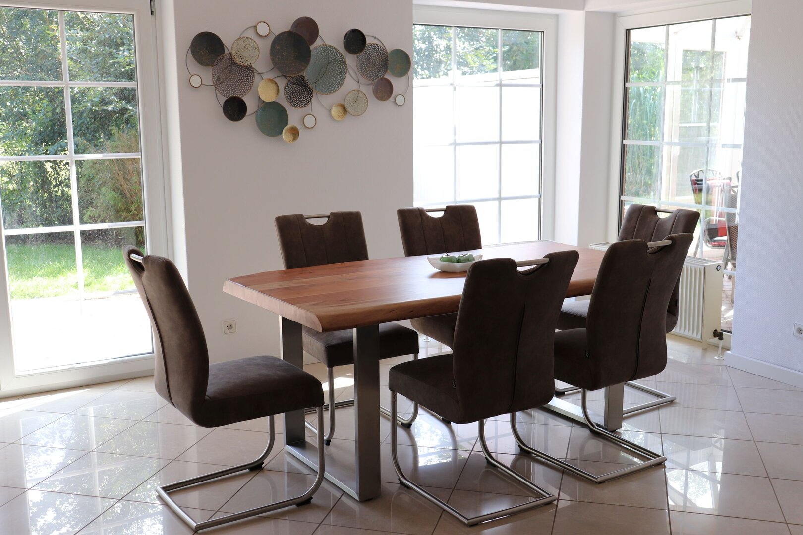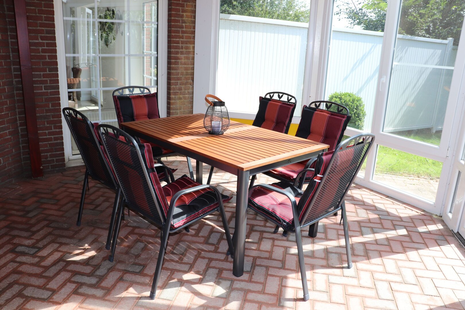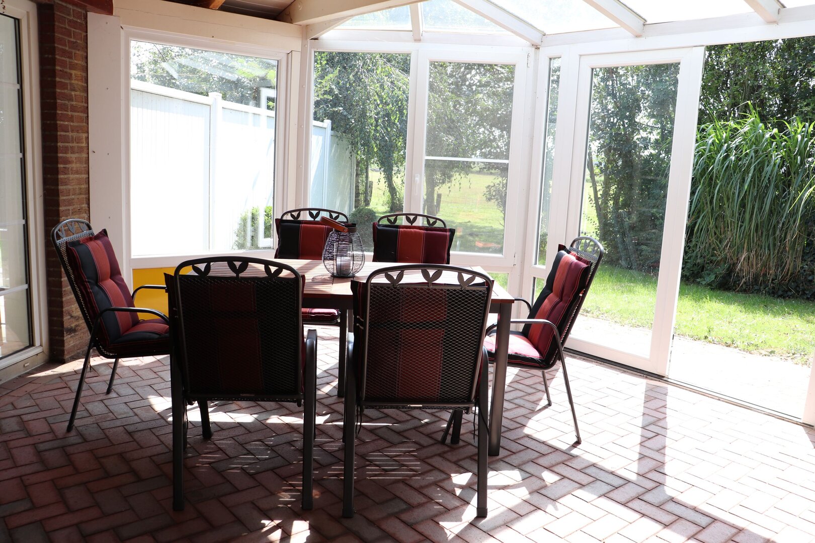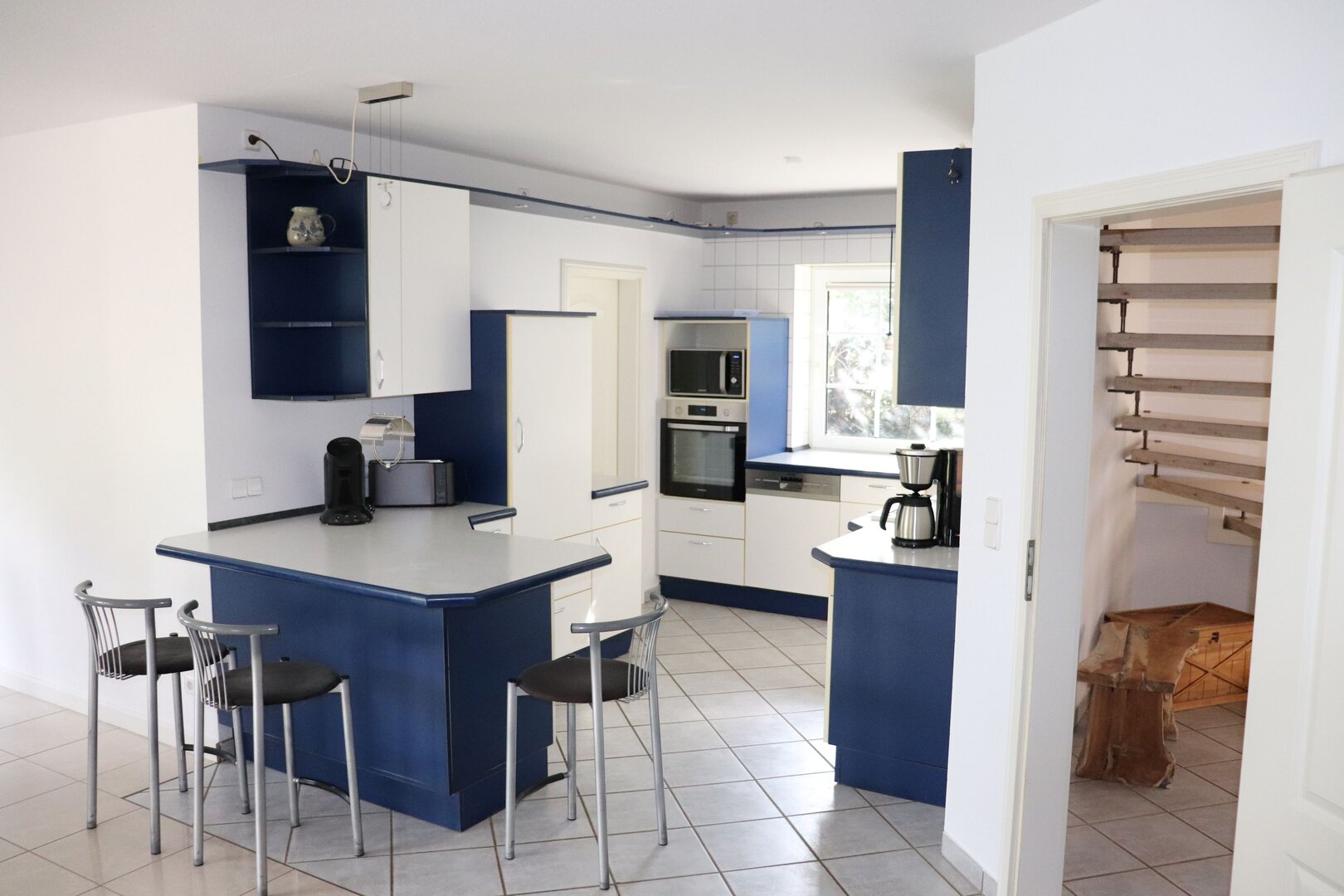 Im Erdgeschoss empfängt den Gast ein großzügiger Eingangsbereich, von dem aus es direkt in den lichtdurchfluteten Wohn- und Essbereich geht. Die offene Küche ist mit einer gemütlichen Theke samt Barhockern ausgestattet – ideal für gemeinsame Kochabende oder ein Glas Wein am Abend. Von hier aus gelangt man auf die überdachte Terrasse und in den gepflegten Garten. Ebenfalls im Erdgeschoss befindet sich ein Gäste-WC sowie ein Hauswirtschaftsraum mit Waschmaschine und direktem Zugang zum Wintergarten, der mit Tisch, Stühlen und bequemen Liegestühlen zum Verweilen einlädt.