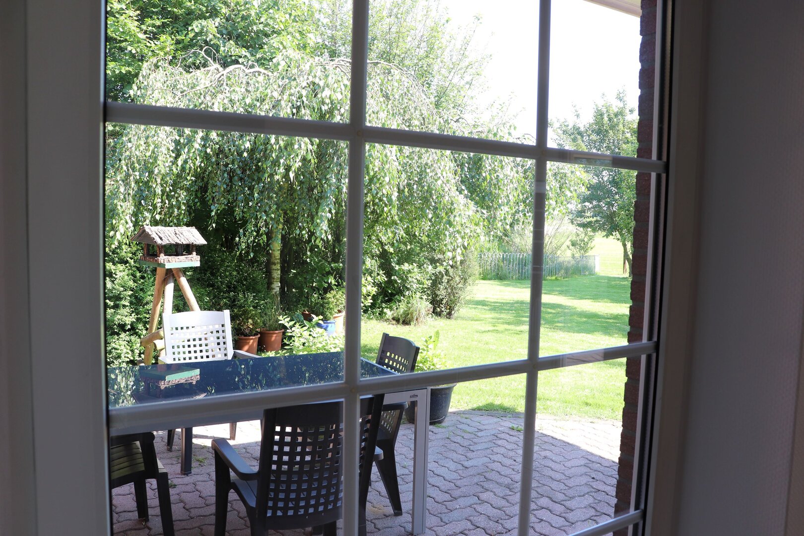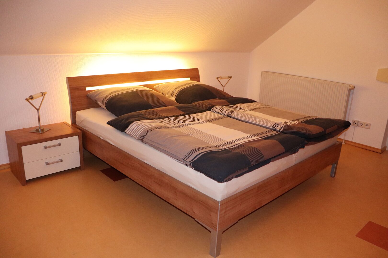 Im oberen Stockwerk befinden sich zwei komfortable Schlafzimmer mit deckenhohen Einbauschränken – eines davon mit Zugang zu einem kleinen Balkon mit herrlichem Blick über den Garten und die angrenzenden Weiden. Das großzügige Badezimmer ist mit Doppelwaschbecken, Dusche und Eckbadewanne ausgestattet – ein Ort der Entspannung nach einem Tag an der Nordsee.